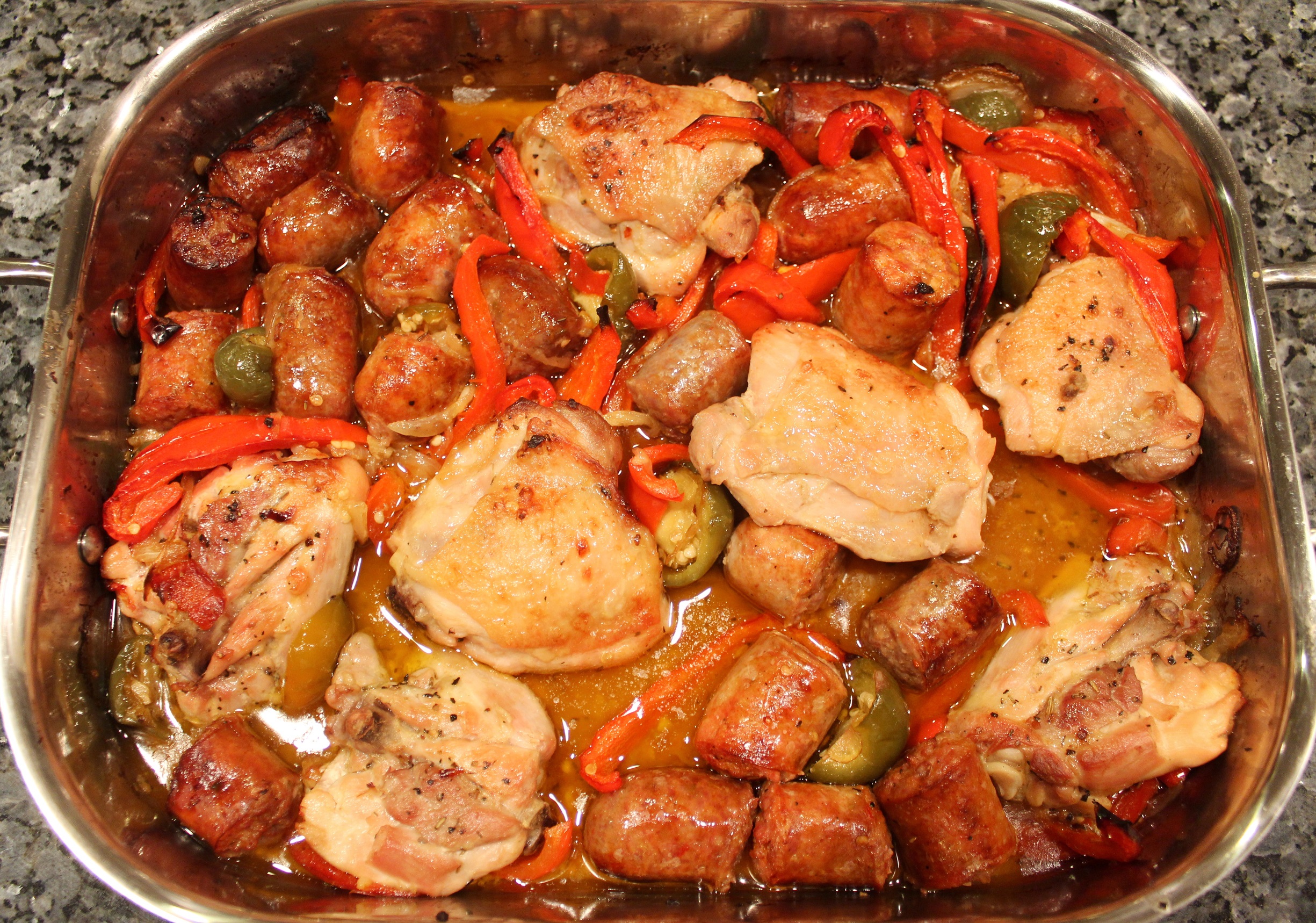 In a baking dish, mix in the chicken thighs, sausages, and veggies and spread evenly across the dish.
